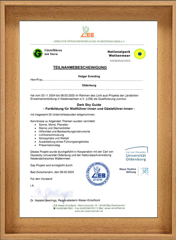 Der „Dark Sky Guide“-Lehrgang ist eine Weiterbildung für zertifizierte Nationalparks- und Landschaftsführer im Nationalpark Niedersächsisches Wattenmeer (sog. „ZNLer“). Ich habe erfolgreich teilgenommen, aber da ich kein ZNLer bin, bin ich kein Dark Sky Guide.