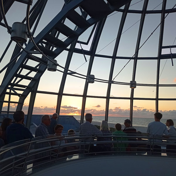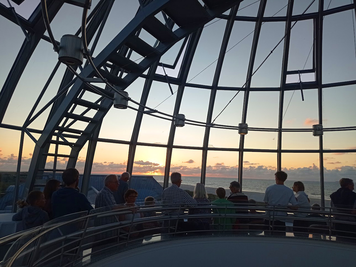 Jeden Abend um 18 Uhr ist ein astronomischer Vortrag mit wechselnden Themen. Anschließend genießen wir den Juister Sonnenuntergang in der Kuppel, und danach geht es zum Sternenspaziergang in Richtung Aussichtsplattform und Strand.