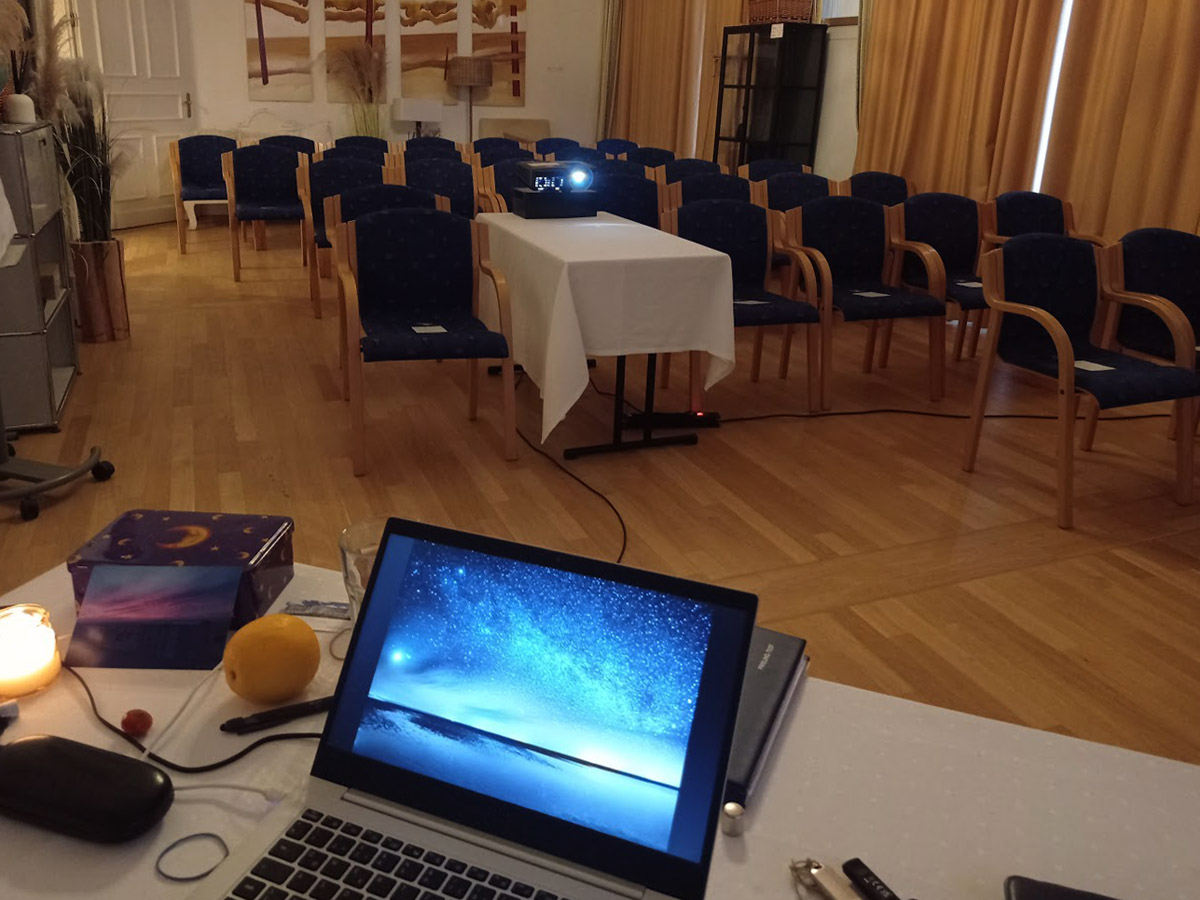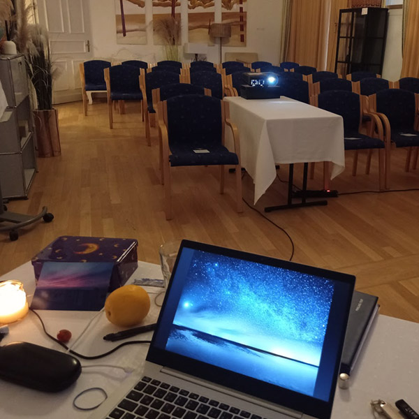 So griffen wir bei der Sternenwanderung auf die Planetariums-Software zurück. Diese stürzte am zweiten Abend immer wieder ab. So schauten wir die Web-Version des Programms, welche umständlich zu bedienen ist, nicht die Vielfalt der Befehle bietet und keine Sternbild-Darstellungen zeigte. Ich hoffe, den Teilnehmern hat es trotzdem gefallen. Die Vorträge „Reise ins Sonnensystem“ und „Reise ins Universum“ klappten aus meiner Sicht recht gut.