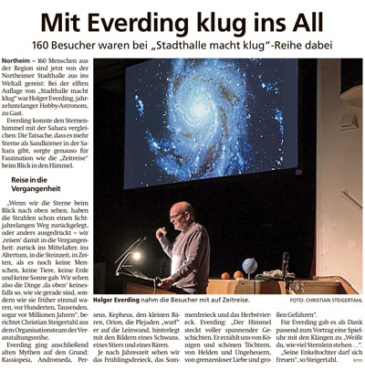 Ende der letzten Septemberwoche hatten wir auf W'ooge das Vergnügen, Holger und seine „Sternenschau“ kennenzulernen - leider wegen der Bewölkung nur im Saale. Holgers Empathie für das Thema Astro-xxx war zu spüren; seine Geduld mit den Zuhörern, denen manchmal Grundkenntnisse fehlten oder die 'artfremde' Fragen stellten, war bewundernswert.