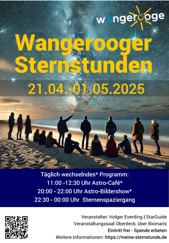 05.03.2025Die Idee entstand 2023 gemeinsam mit der Kurverwaltung: angesichts geringer Lichtverschmutzung lässt sich der Sternenhimmel auf Juist perfekt erkunden, wo gibt es so etwas noch? Ein Juist-Argument für neue und vorhandene Touristengruppen. Unkompliziert sagte die Kurverwaltung schnell zu, eine Astro-Veranstaltungsreihe mit Ankündigungen, Unterkunft und Räumlichkeiten zu fördern. So machte ich mich an die Vorbereitungen... und kam 2024 für ca. zwei Wochen wieder für Vormittags-Seminare, Abendvorträge sowie spätabendliche Sternwanderungen.